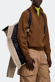 - Packable into interior left pocket. Converts into a cinchable bag with a carrying strap