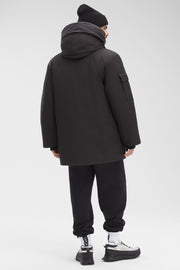 - Adjustable down-filled hood adds warmth and element protection. Hood Trim can easily be folded back during mild conditions