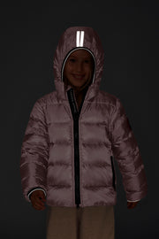 - Down-filled hood with reflective trim stitching