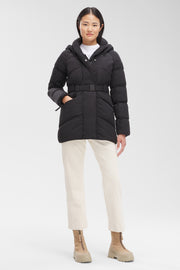 • Chevron quilting pattern and cinchable belt for perfect fit