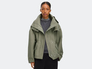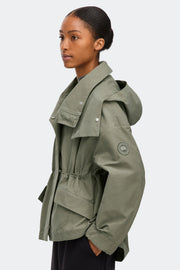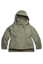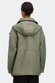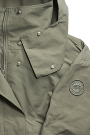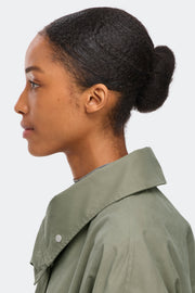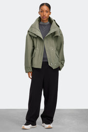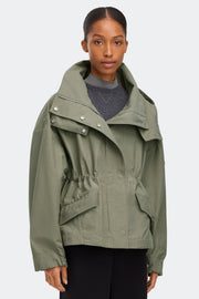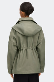 The Olivine Jacket features a dramatic high collar with a removable wrap hood, an interior drawcord to cinch the waist, and a high-low hem. This version of the Olivine is crafted from Lightweight Cotton Nylon Canvas, a durable fabric made with recycled nylon.