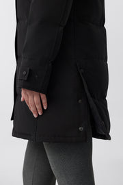 Adjustable down-filled hood adds warmth and element protection.