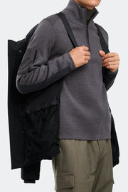 - Sleek interior hanging lining with backpack straps allow jacket to be carried hands-free ov er the shoulders