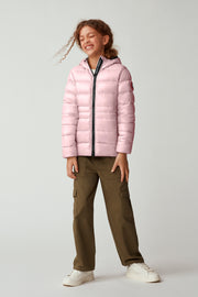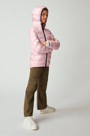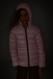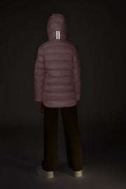 - Down-filled hood with reflective trim stitching adds warmth and element protection